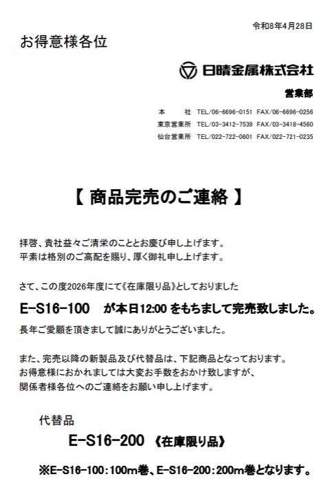 - 2026-04-30【商品完売のご連絡】E-S16-100